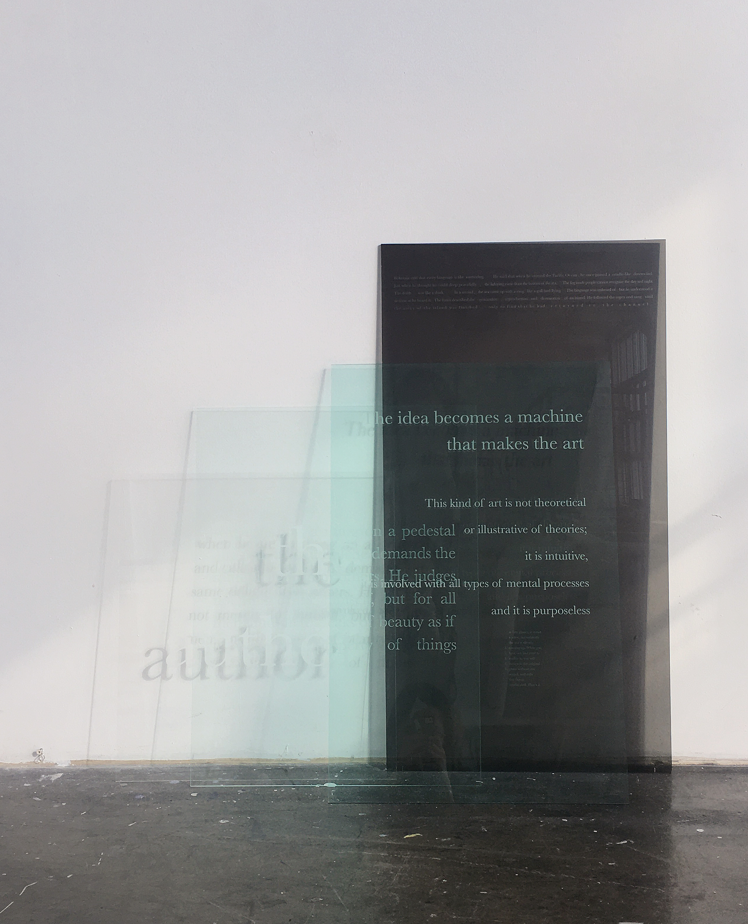 In an ideal installation, the installation space will be an open space filled with different inscribed panels. The shelves from On Display will be installed in the center of the space and different panels will be stacked on the floor leaning against the shelves or against the wall. The stacked panels ask the viewers to think about the relationship between different panels, how their ideologies overlap or how they contradict each other. These panels have the same sizes as the ones on the shelves. They could be on the shelves but instead they are left on the floor. By showing them along with the shelves, I ask the viewers to rethink what references are appropriate to apply and what ideologies we want to accept.